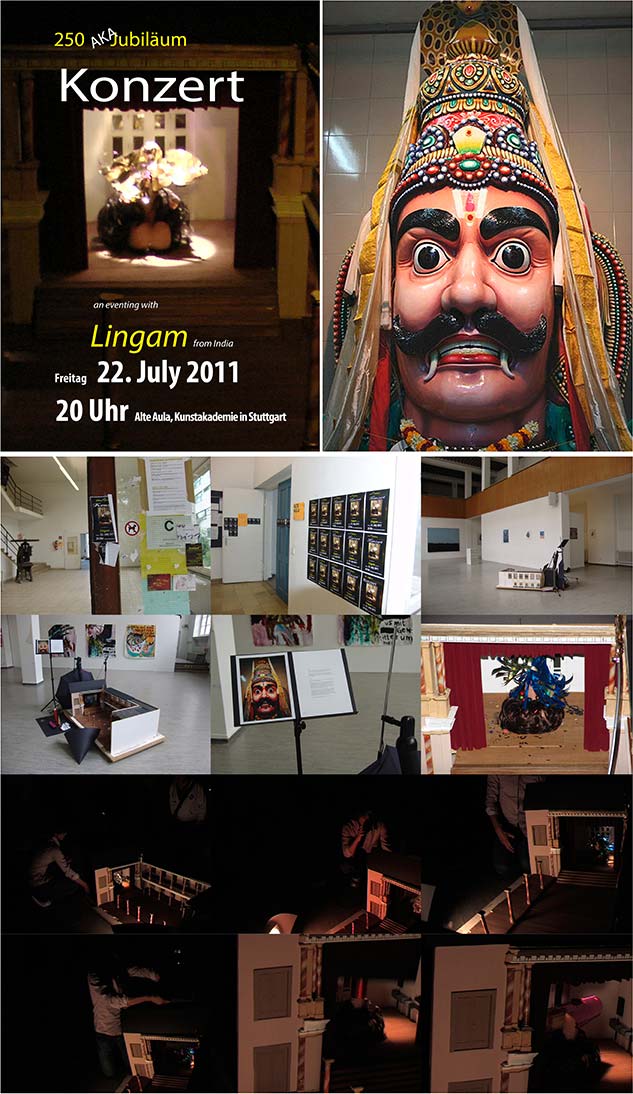 The performance resembles a puppet theater. On the stage of a small opera-theater-model there is a dildo “Lingam” symbolizing Krishna. The dildo is dressed in multicolored paper so that it looks like a puppet. The paper dresses are changed and the levels of vibration varied which generates differing sound. The artist plays the host of this opera while Lingam is assigned the role of the singer. The host names and presents the individual vibration levels as love songs for Aravan.